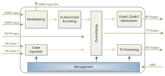 REM7502 HDMI to DVB-T/DVB-C 4K Encoder Modulator offers a professional and high-integrated modulator, together with multiplexing, encoding, re-multiplexing and modulation functions. The device accepts HDMI UHD signals and compresses in H.265 HEVC or H.264(MPEG-4 AVC), and modulates in DVB-C or DVB-T. It is also able to input with IP and ASI signals for multiplexing. This new item meets the coming needs and requests on UHD 4K ages. It can be widely applied to IPTV system, digital TV broadcasting & distribution systems, home entertainment, advertisement broadcasting, etc., in shopping mall, hospital and school, hotel and restaurant, museum, theater, cinema, community, airport, railway station, public square, club, and so on.
