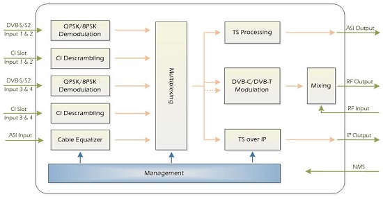 REM7004 4*DVB-S/S2 to DVB-C/DVB-T TransModulator offers a professional and high-integrated modulator, together with demodulation, re-multiplexing and modulation functions. The device is able to accept 4 satellite signals in DVB-S/S2, demodulate and re-multiplex them with additional ASI in or/and RF(DVB-C, DVB-T, ISDB-T or ATSC) in. The device then modulates signals in DVB-T(in 1 or 2 adjacent carriers) or DVB-C(in 1 or 4 adjacent carriers). Due to its professional and full functions, REM7004 has been widely applied to IPTV system, digital TV broadcasting & distribution systems, home entertainment, advertisement broadcasting, etc., in shopping mall, hospital and school, hotel and restaurant, museum, theater, cinema, community, airport, railway station, public square, club, and so on.