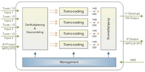 | Video Transcoding | HD to HD | 4*MPEG-2 HD to 4*H.264/4*MPEG-2 HD; 4*H.264 HD to 4*MPEG-2/4*H.264 HD |