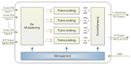 | SD to SD | 8*MPEG-2 SD to 8*H.264/8*MPEG-2 SD; 8*H.264 SD to 8*MPEG-2/8*H.264 SD |