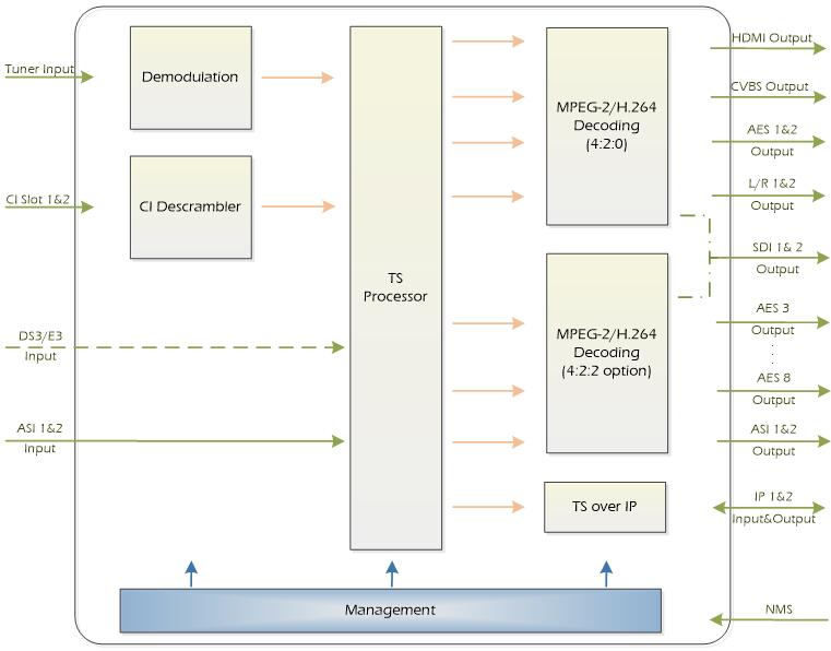 | TS Input | Demux and Remux among Tuner / ASI / IP / DS3(optional) / E3(optional) | |||